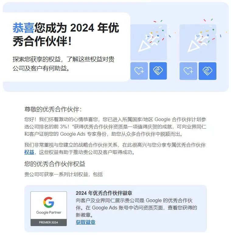穀歌年度"優秀合作夥伴"是穀歌每年在全球各個國家和地區的合作夥伴中,僅有排名前3%的合作夥伴才能獲得的殊榮。