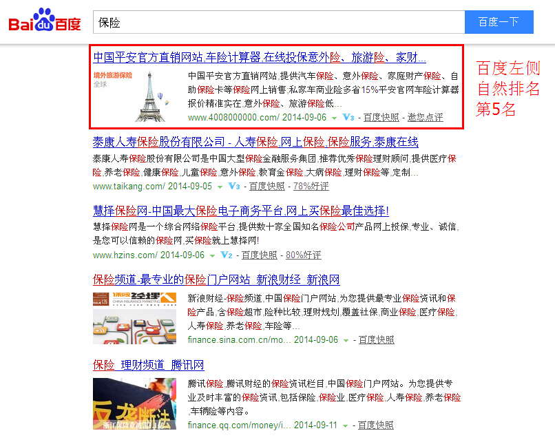 保險:操作初期,“保險”一詞排名在百度自然排名十頁以外,經我方操作一段時間後,現穩定在首頁