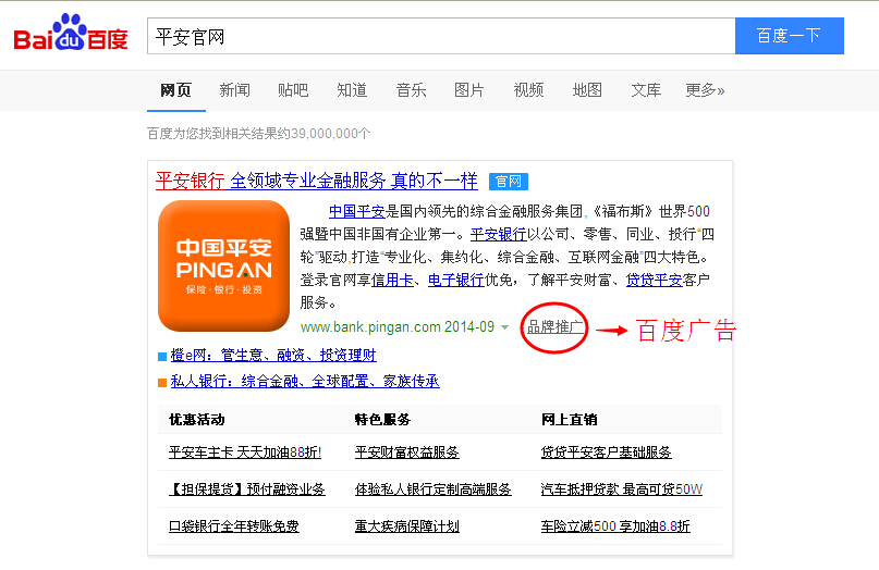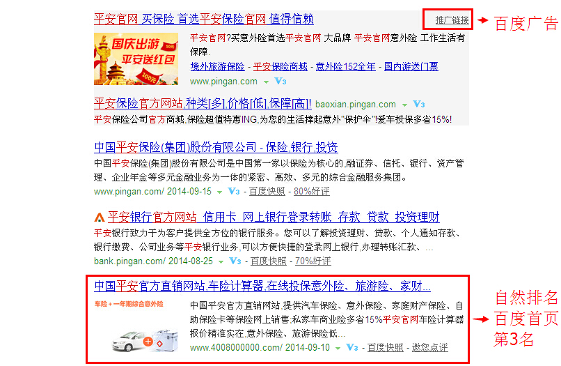 平安官網:之前百度首頁的自然排名均被pingan.com域名占據,先我方操作網站4008000000.com排名進入首頁