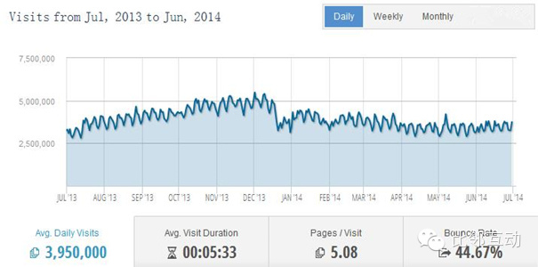 2014年6月份的总体流量:平均345万/天的访问量,平均停留时间为5:20分钟,平均浏览页面数为5.33,网站跳出率为49.21%