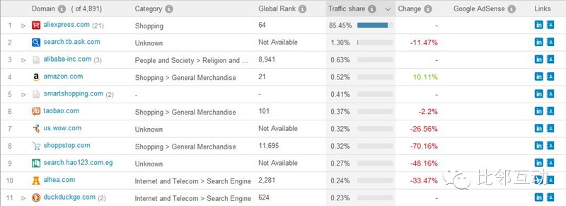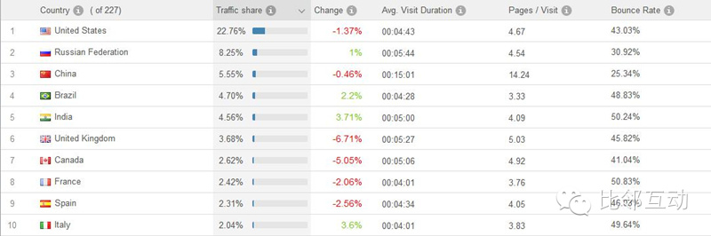 Alibaba的国家流量目前覆盖到222个国家,以下列出流量排列前十的国家。