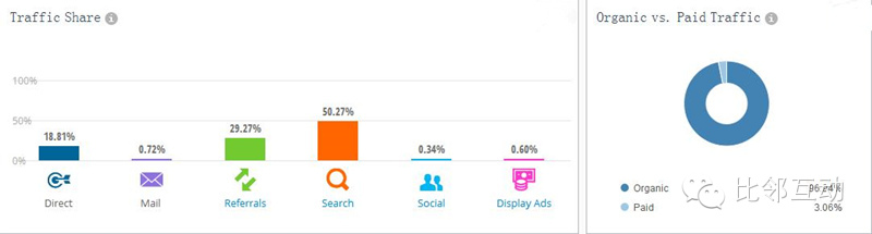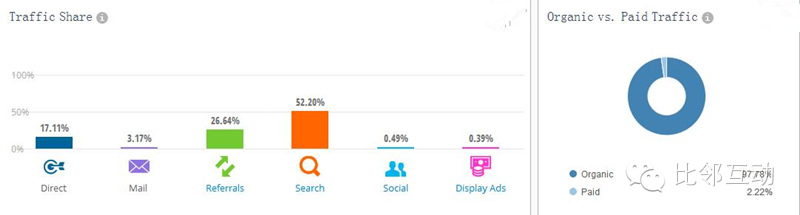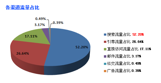 其中直接访问流量占比17.11%,社交流量占比0.49%,搜索流量占比52.22% ,引荐流量占比26.64%,邮件流量占比3.17%,广告流量占比0.39%