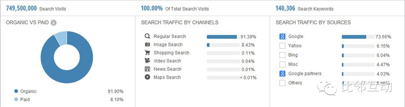 从上述阿里巴巴国际站电商平台流量分析中可以看出,其各渠道流量比重依次为:搜索流量占比52.20%,引荐流量占比26.64%,直接访问流量占比17.11%,邮件流量占比3.17%,社交流量占比0.49%,广告流量占比0.39%。可见拥有巨大流量的阿里巴巴国际网站也十分依赖于搜索引擎。而在阿里巴巴搜索渠道中,自然搜索流量占比90.36%,付费搜索流量占比9.64%,由此可见搜索引擎流量的重要性,免费搜索引擎流量更是重中之重。