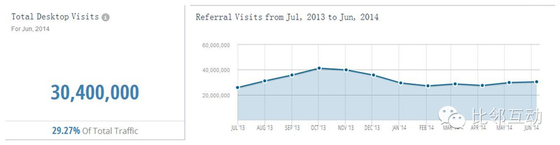 6月份的引荐流量占比29.27%,平均为网站贡献了101万/天的流量。