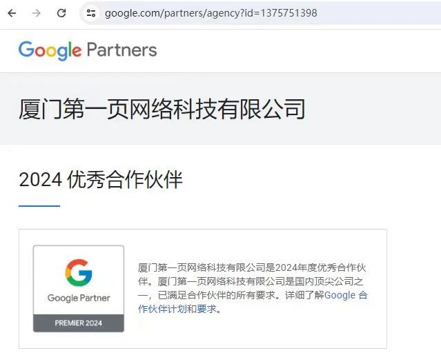 2024年2月,廈門第一頁網絡科技有限公司榮幸地成為穀歌2024年度的"優秀合作夥伴"之一。