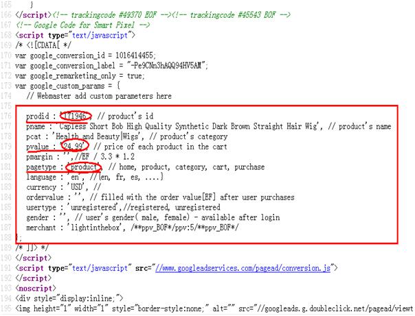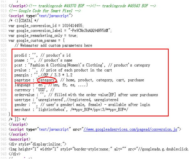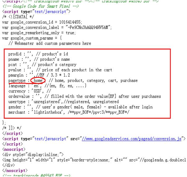 ¶ä»é¡µé¢å°±ä¸ä¸ä¸å举äºï¼æ°æ®èªå®ä¹åæ°è¶è¯¦ç»ï¼åé¢Adwords卿åè¥éæ°æ®Cookiesç»åä¹è¶è¯¦ç»ï¼ææ¾å¹¿åç精度ä¹è¶é«ï¼ä¾å¦ä¸é¢lightintheboxé¤äºå®ä¹åºæ¬çprodidãecomm_pagetypeãecomm_totalvalueä¸ä¸ªåæ°ä¹å¤ï¼è¿èªå®ä¹äºpcatãpmarginã languageãcurrencyãgenderççã