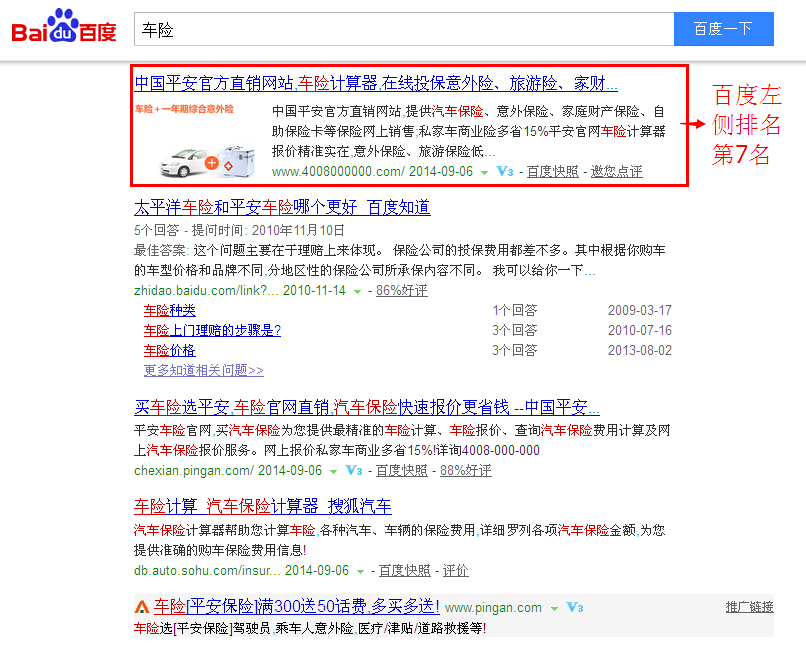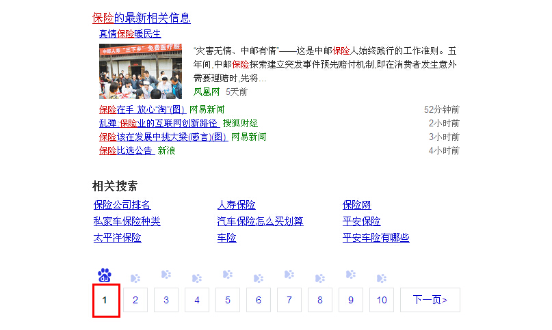 保險:操作初期,“保險”一詞排名在百度自然排名十頁以外,經我方操作一段時間後,現穩定在首頁